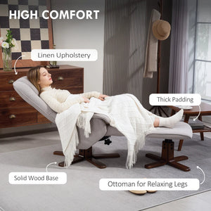 HOMCOM Linen Swivel Recliner Chair with Footstool, Upholstered Reclining Armchair with Wooden Base for Living Room, Light Grey